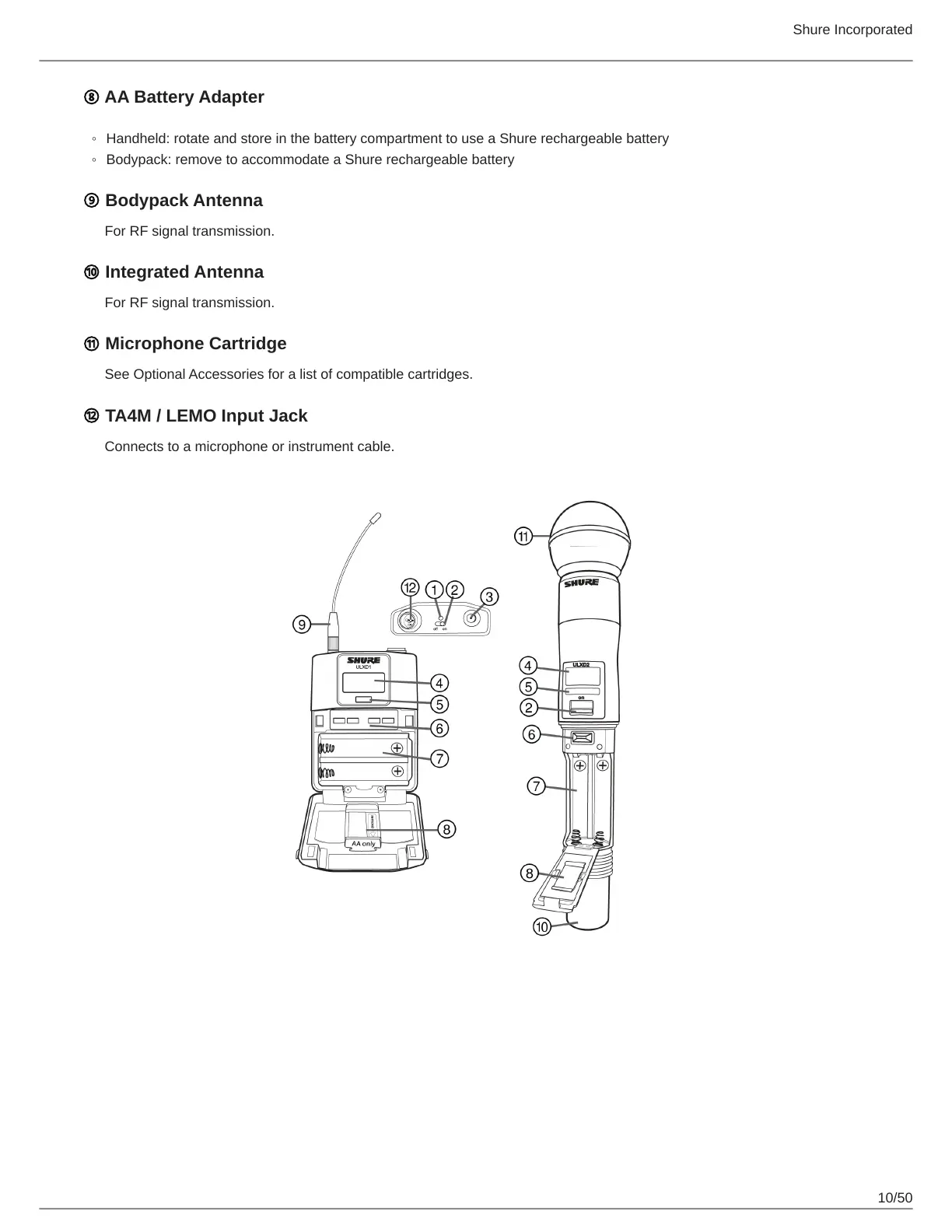 Handheld: rotate and store in the battery compartment to use a Shure rechargeable battery
