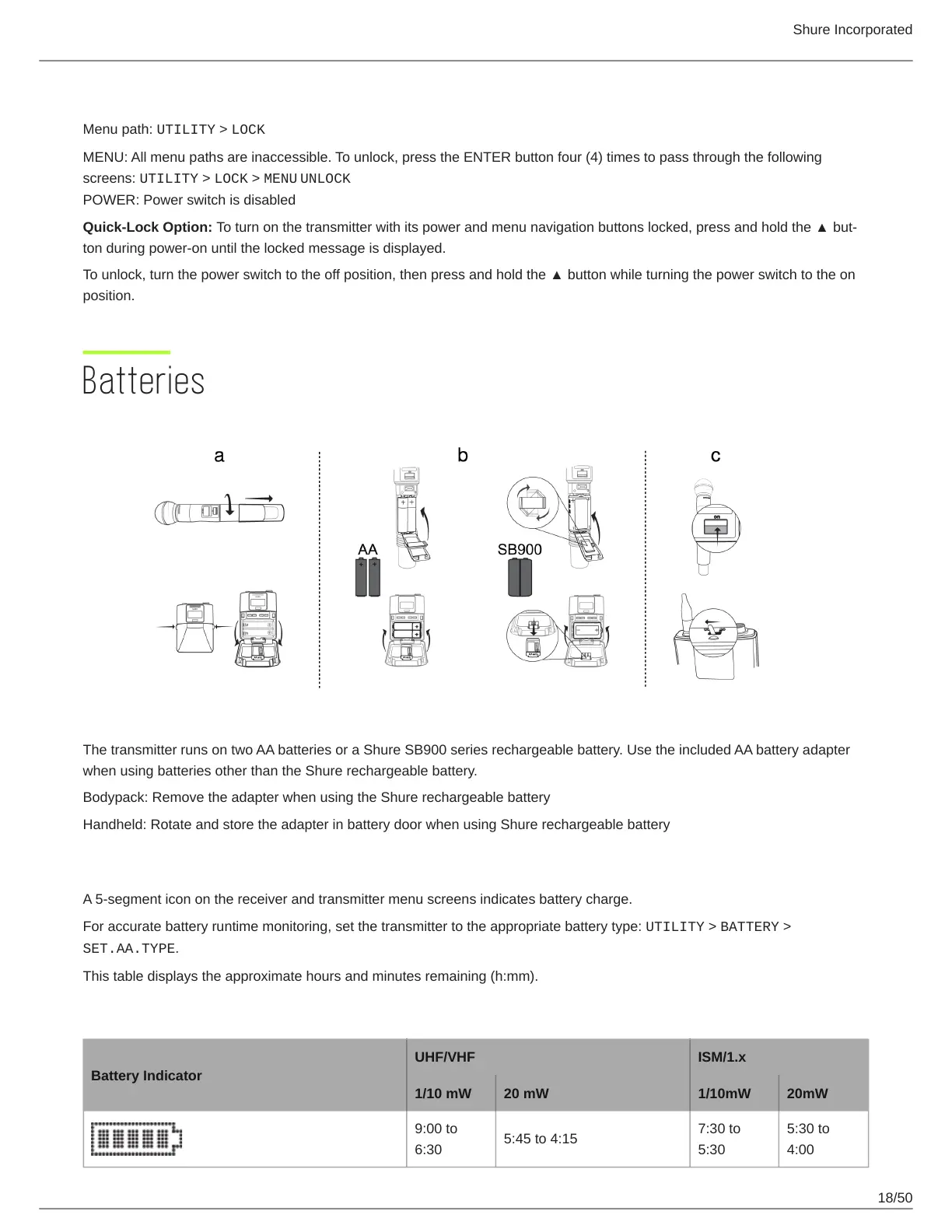 The transmitter runs on two AA batteries or a Shure SB900 series rechargeable battery. Use the included AA battery adapter