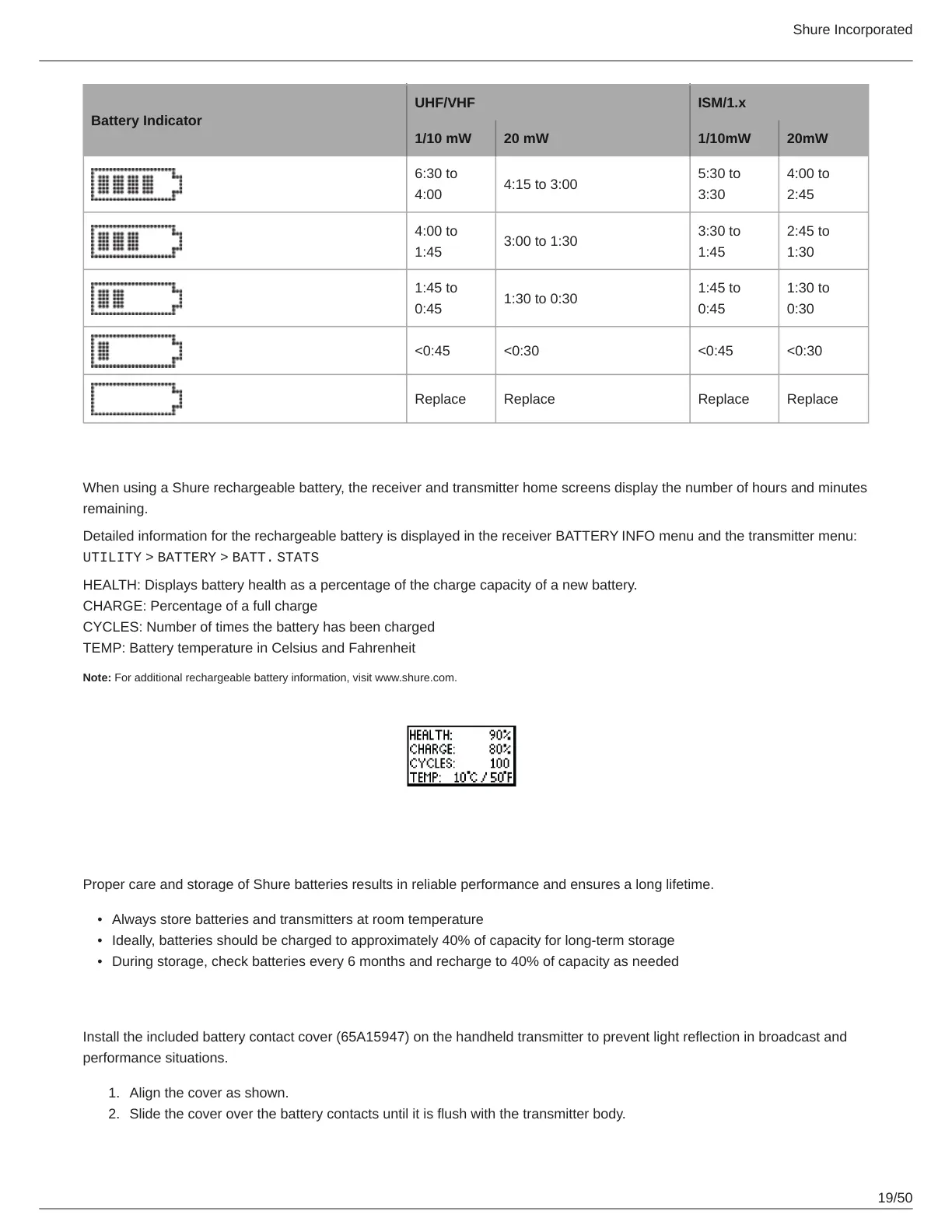Proper care and storage of Shure batteries results in reliable performance and ensures a long lifetime.