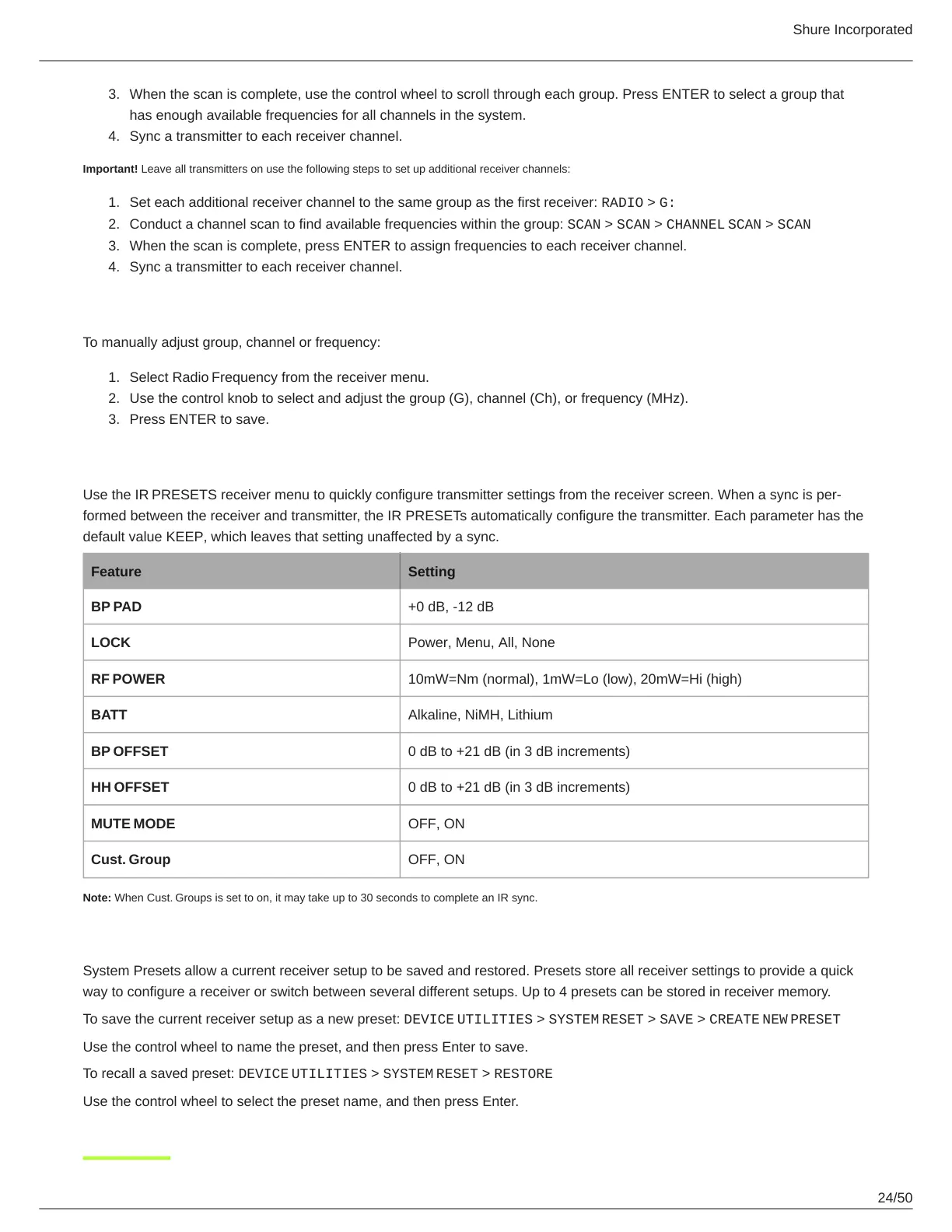 Conduct a channel scan to find available frequencies within the group: SCAN > SCAN > CHANNEL SCAN > SCAN