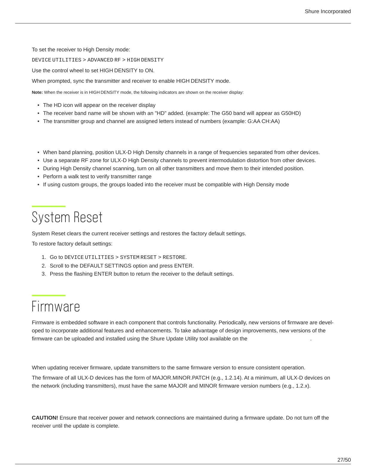 The firmware of all ULX-D devices has the form of MAJOR.MINOR.PATCH (e.g., 1.2.14). At a minimum, all ULX-D devices on