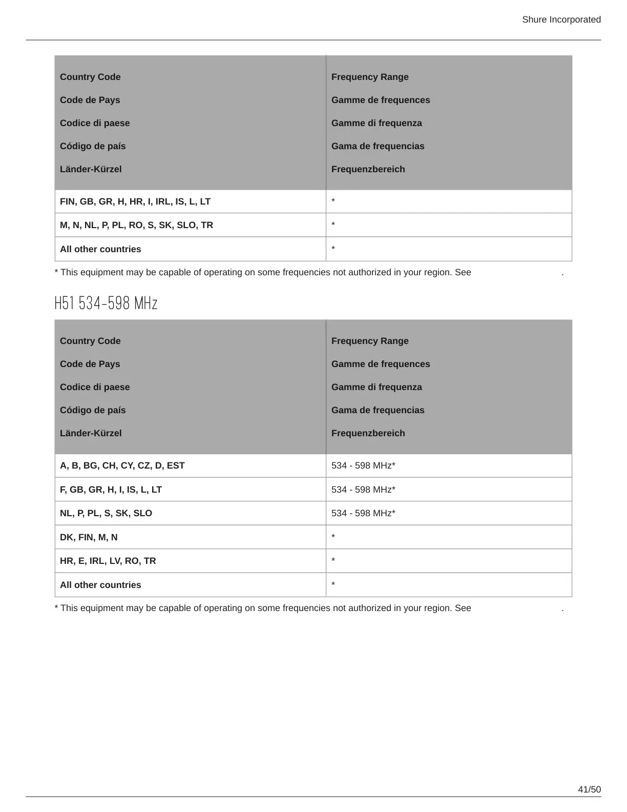 F, GB, GR, H, I, IS, L, LT 534 - 598 MHz*