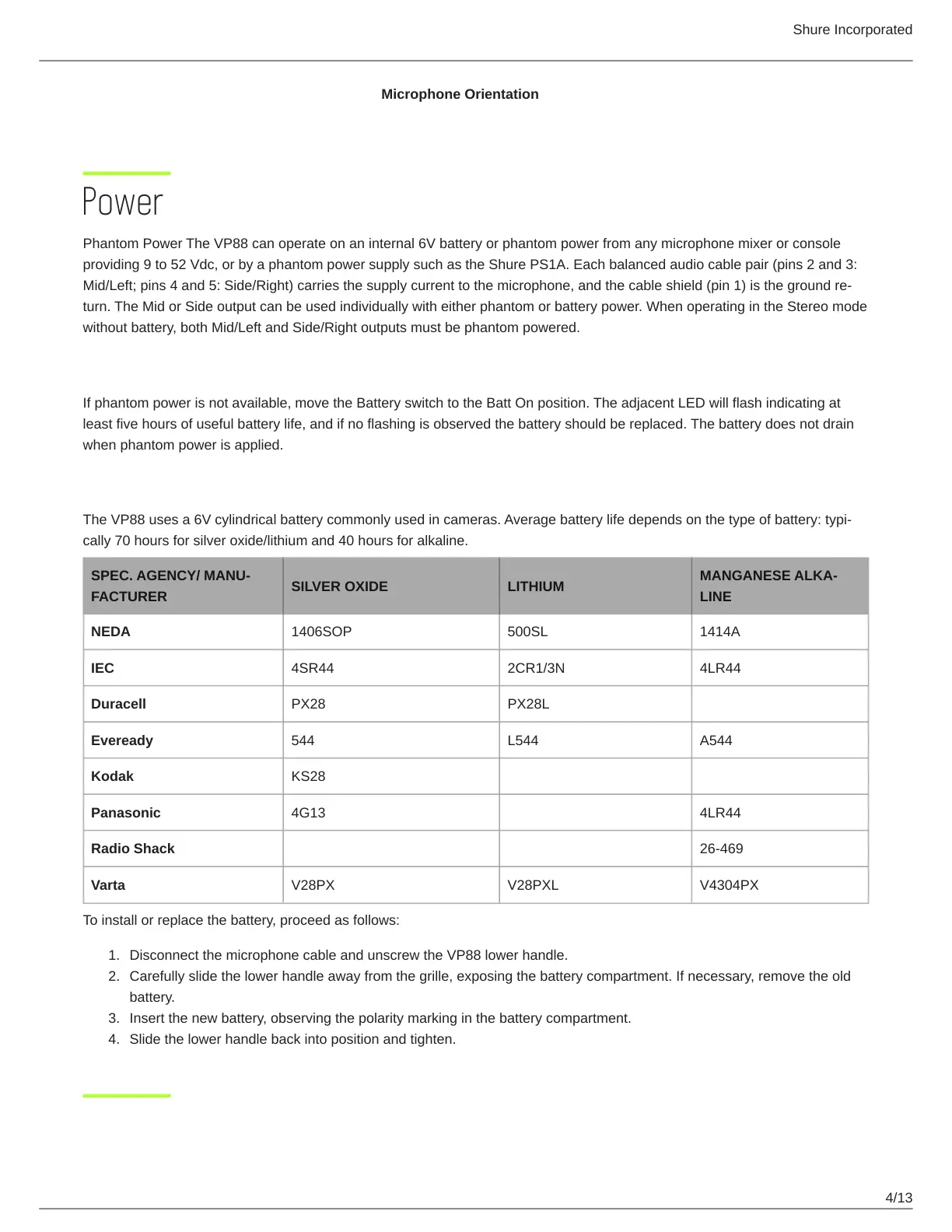 Phantom Power The VP88 can operate on an internal 6V battery or phantom power from any microphone mixer or console