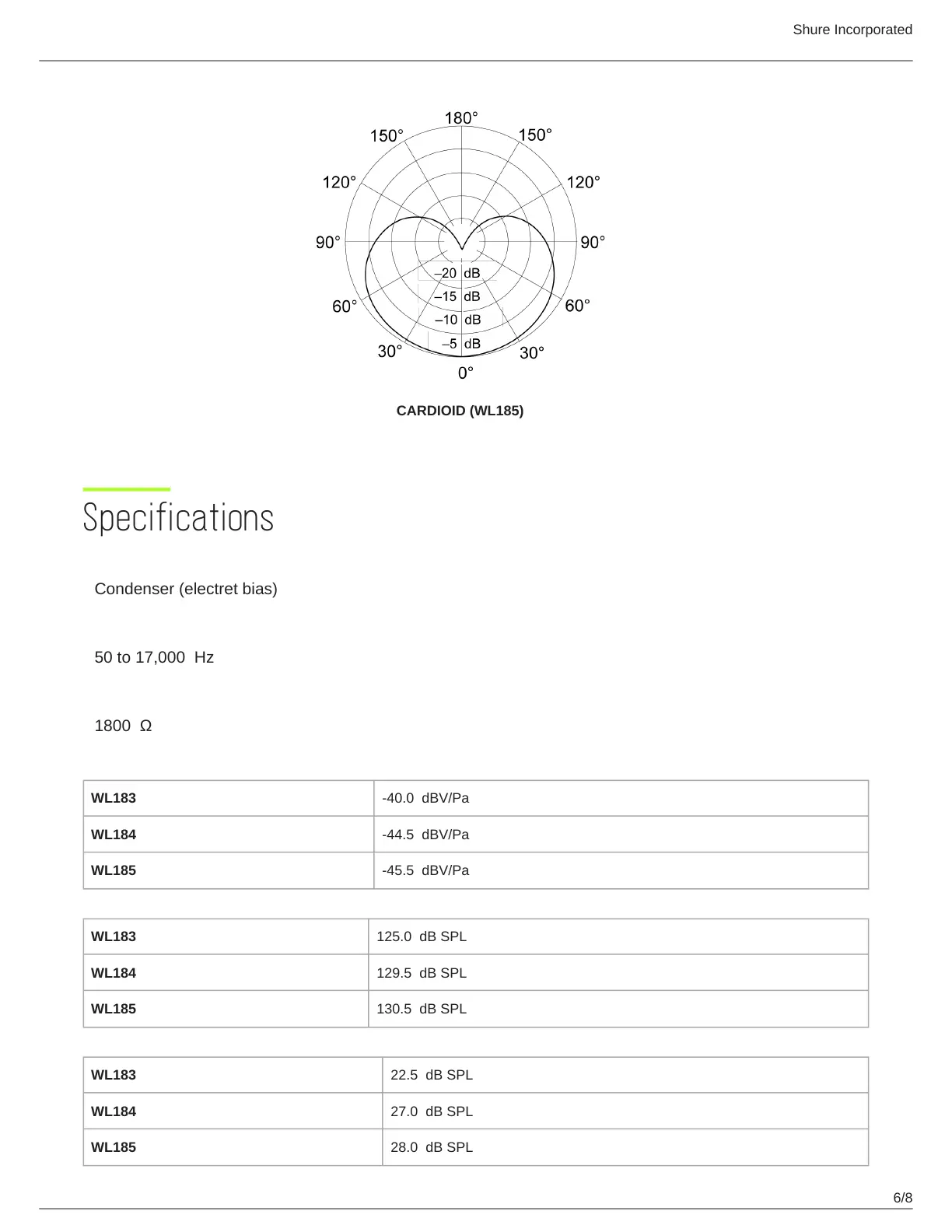 Shure WL183 - Specifications; Sensitivity; Maximum SPL; Self Noise (A-Weighted)
