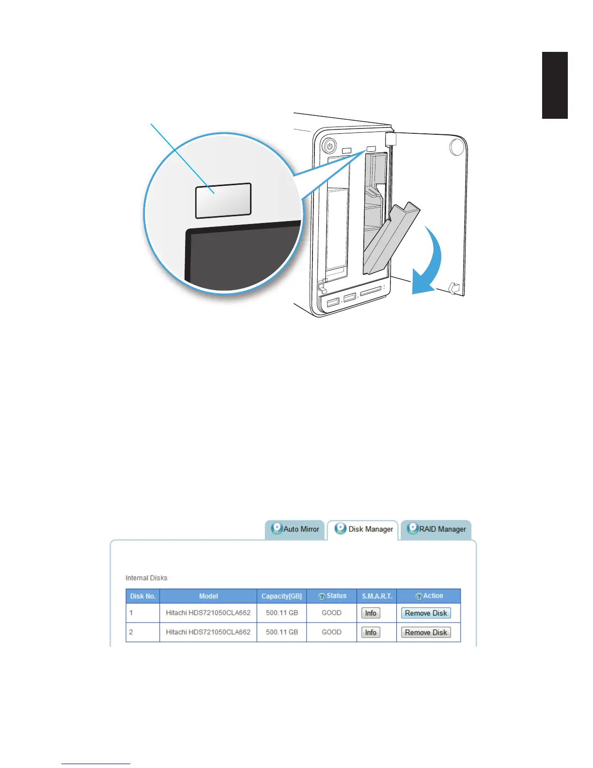 After a short time, the Status tab in Disk Manager detects and displays the new HDD sta-