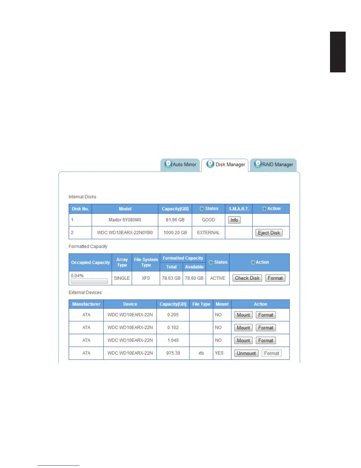From the Disk Manager screen, you can Eject Disk, Mount/Unmount and Format the new exter-