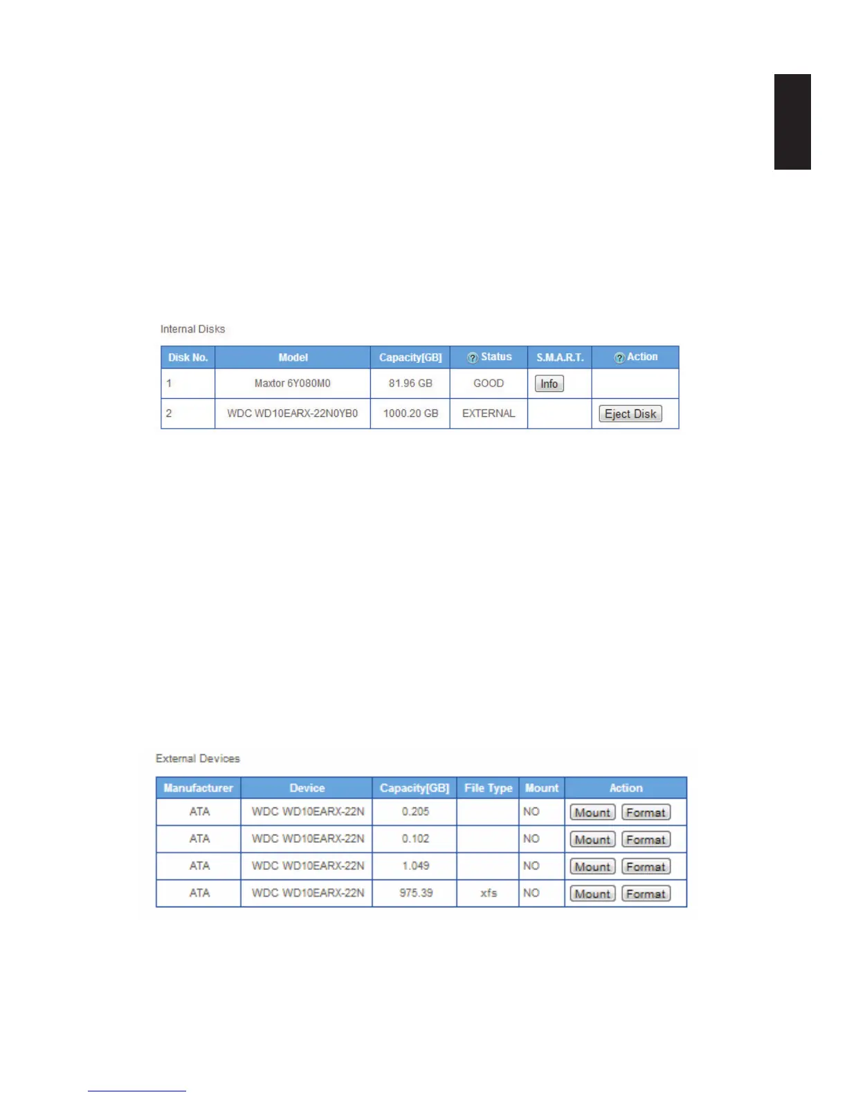 2. In the External Devices menu, select a volume and click Mount in the Action column.
