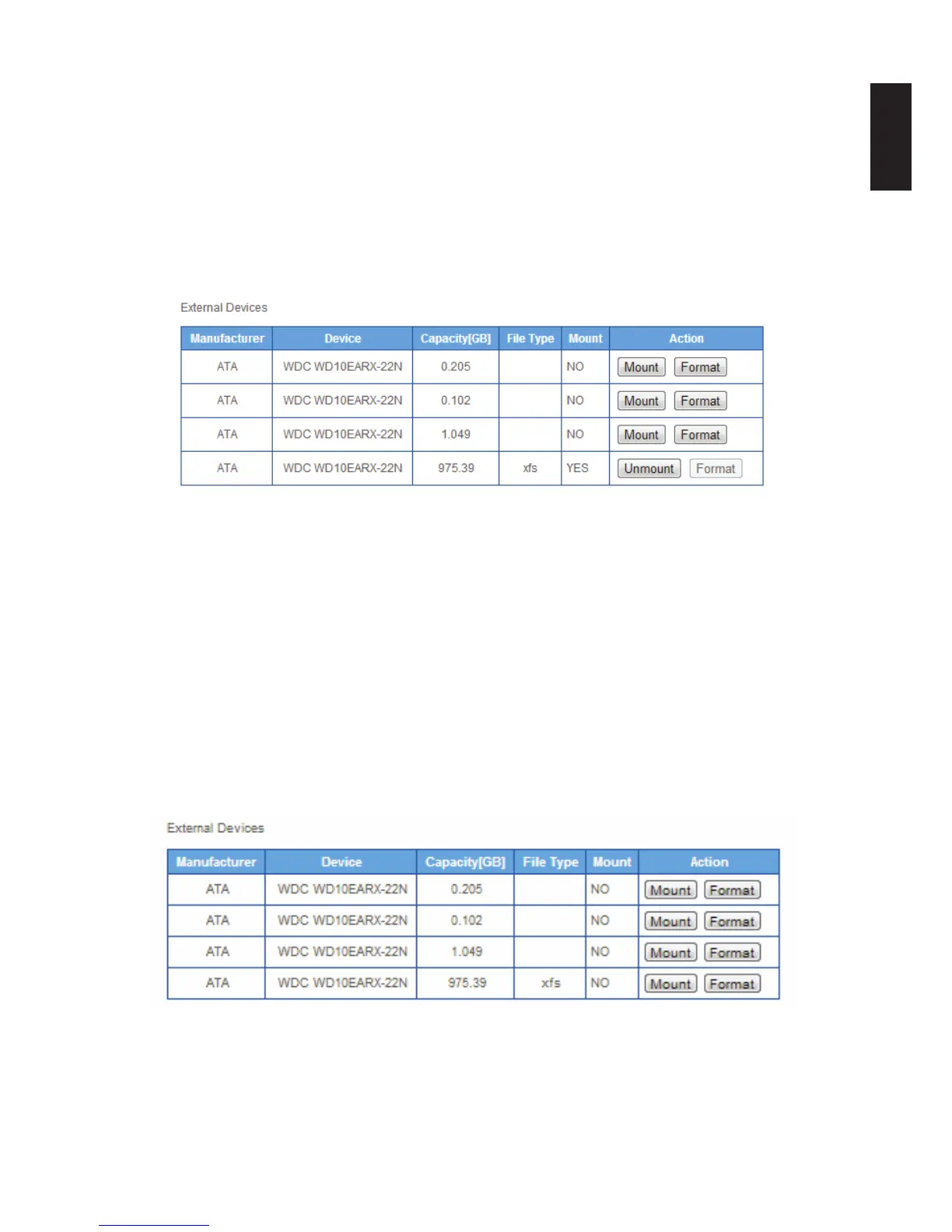 2. In the External Devices menu, select a volume and click Unmount in the Action column.
