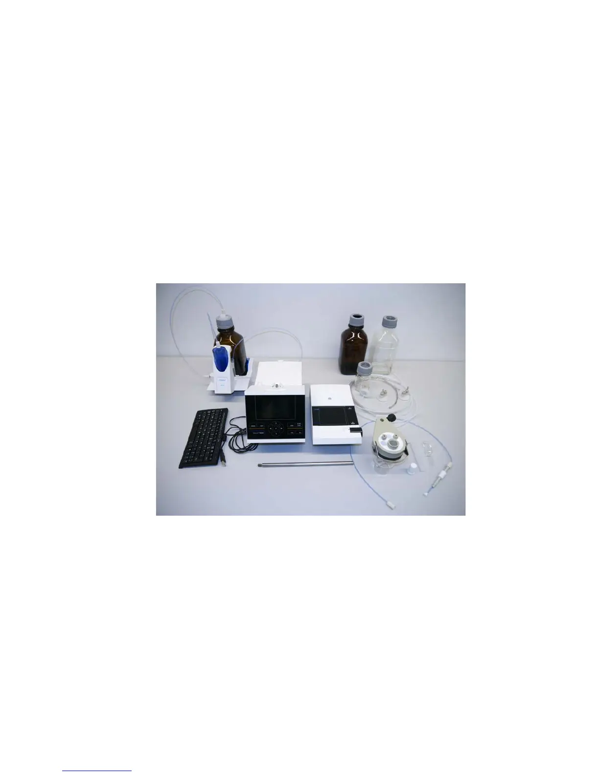 • The KF titration stand (pump and stirrer) TM 235 KF including waste (1 L clear bottle), solvent (1 L amber