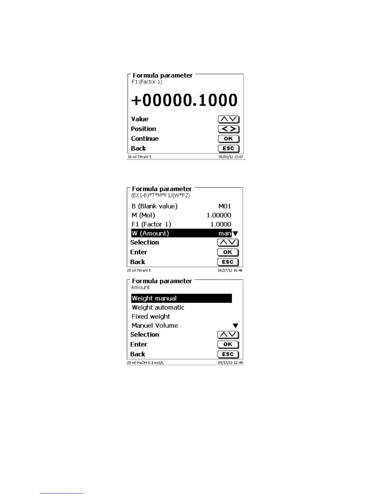 • Manual sample weight: The sample weight is enquired by a prompt at the start of the method/after