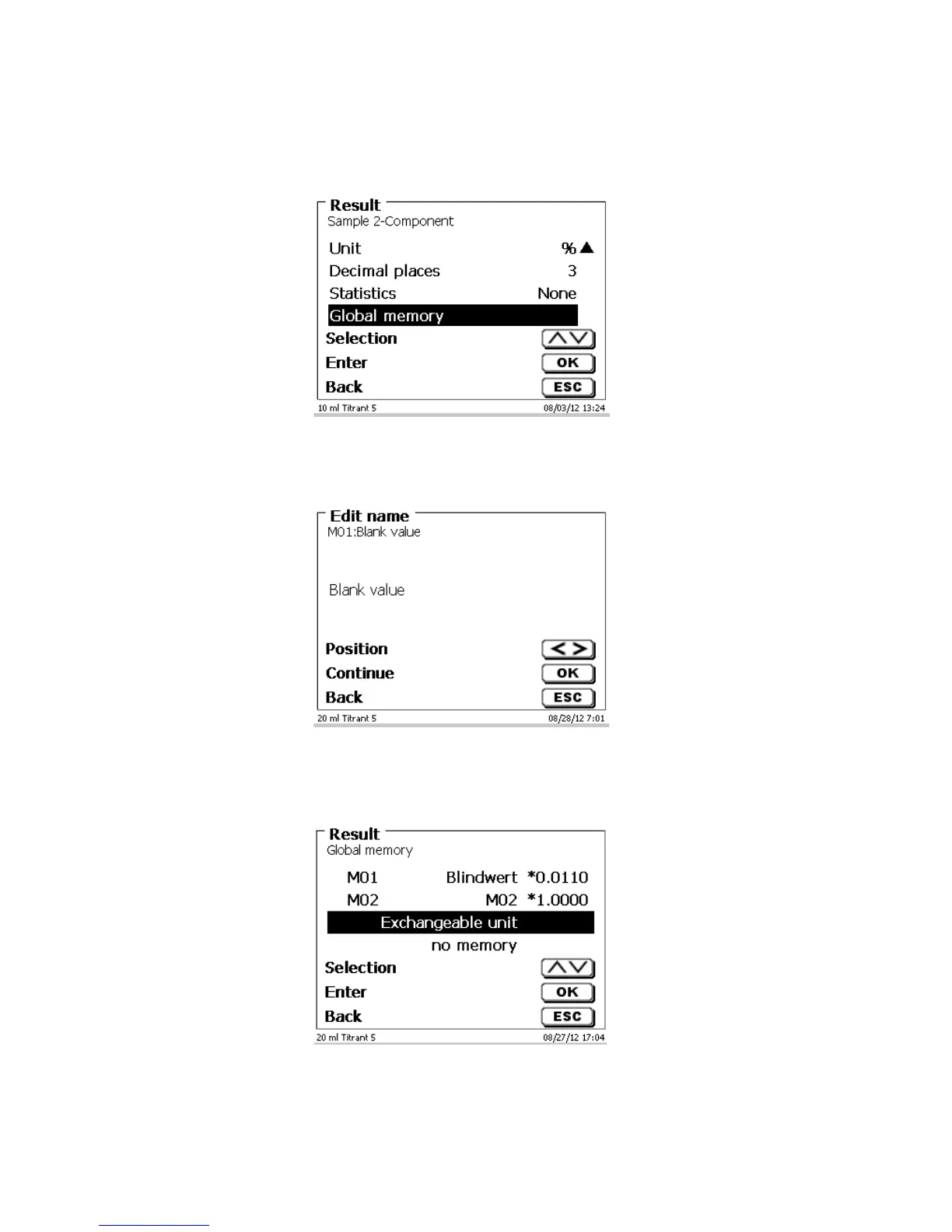 The titrator proposes a memory name, such as M01 (M01- M50). The name of the memory can be changed in