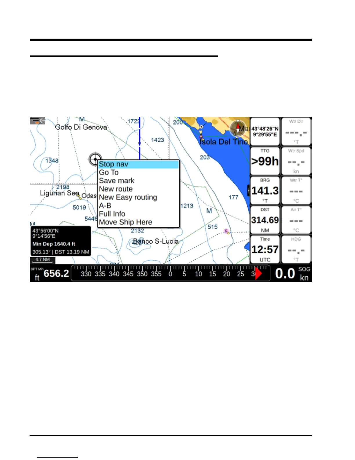 position (departure point). All navigation data in data window, such as BRG, TTG, DST, XTE,