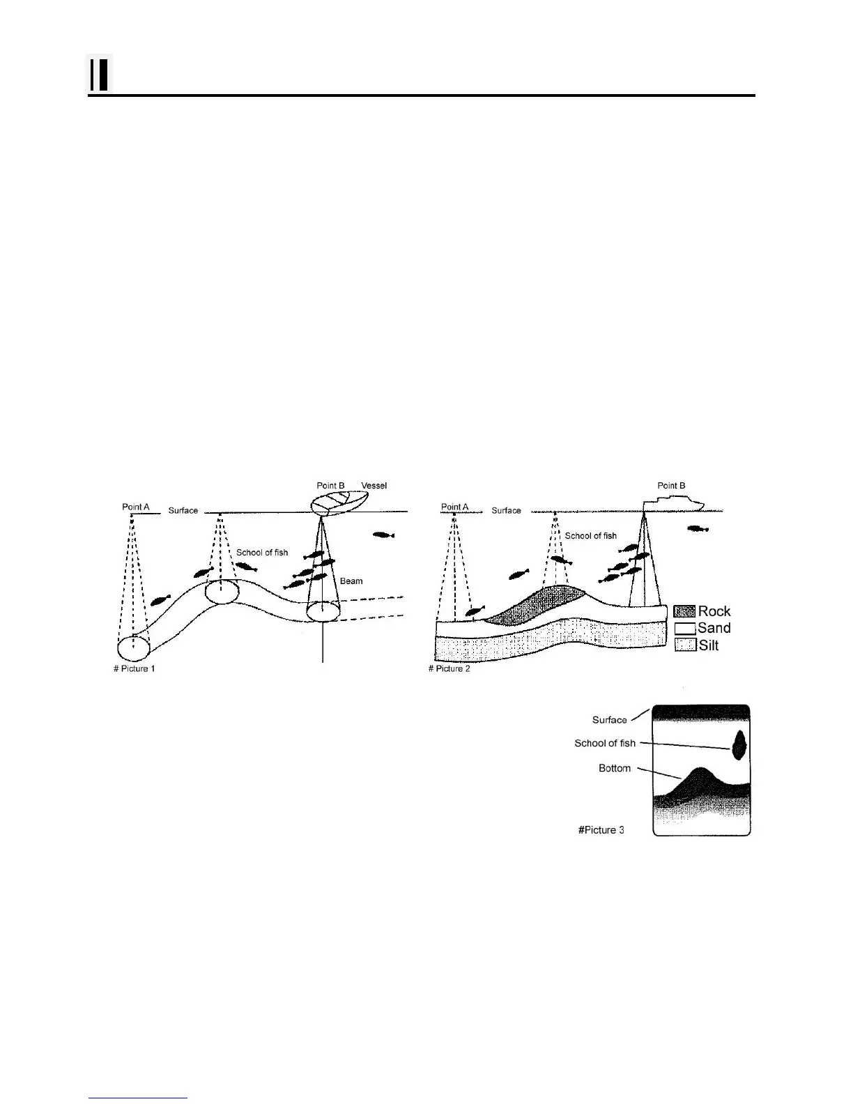 toward the bottom. The signal travels through the water until it strikes an object or the bottom. It is