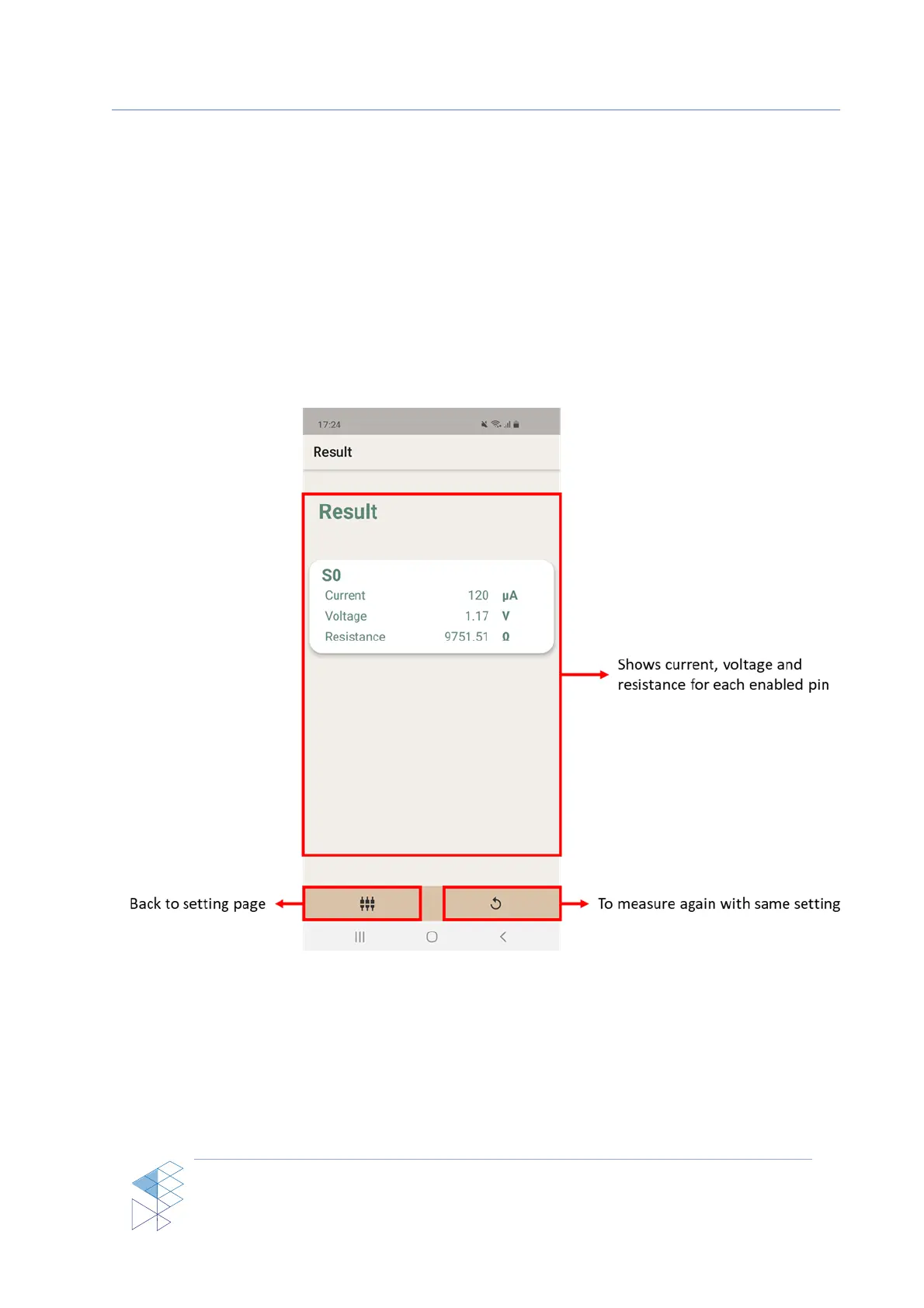 In the Result page bias current, voltage and resistance for each enabled pin will be