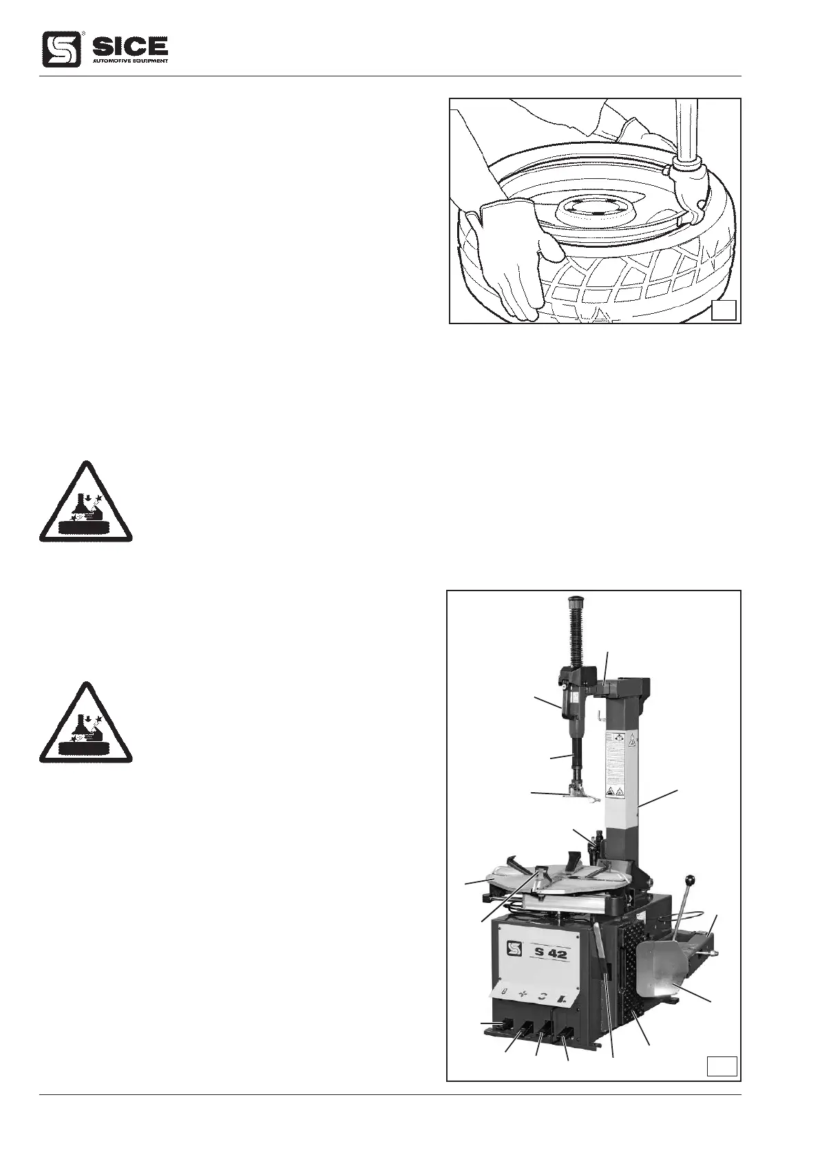 for the upper bead. When the tyre is mounted, depress pedal (7, Fig. G) to move