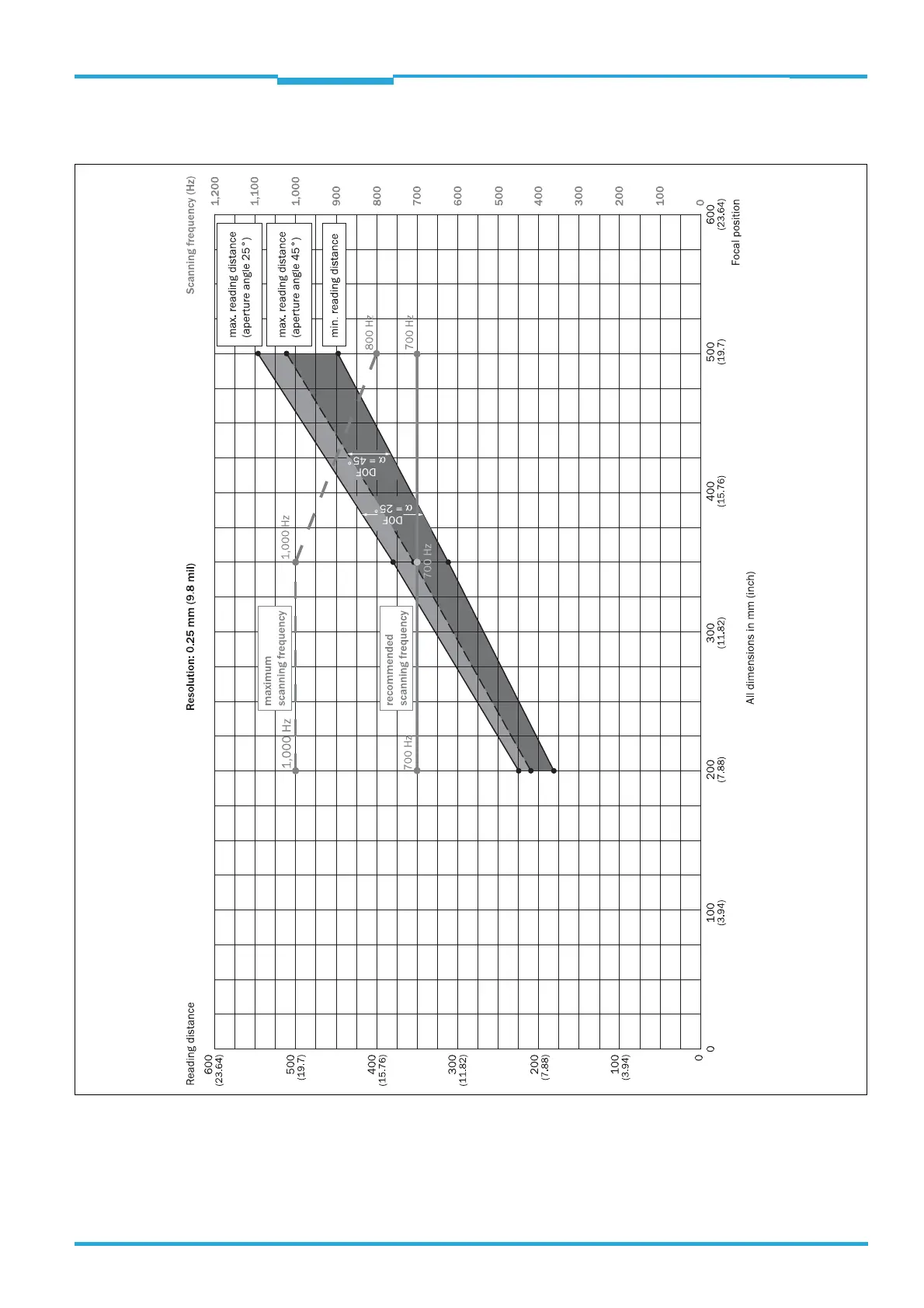 Fig. 10-3: Depth of field ranges of the CLV650 line scanner with front reading window: min. und max. reading distance depending on