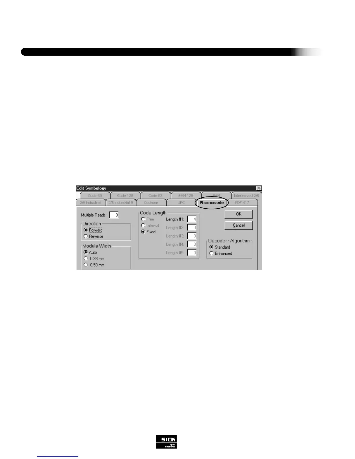 “0”. There are no start and stop characters associated with the pharmacode. Thus, depending on the scan direction, different data