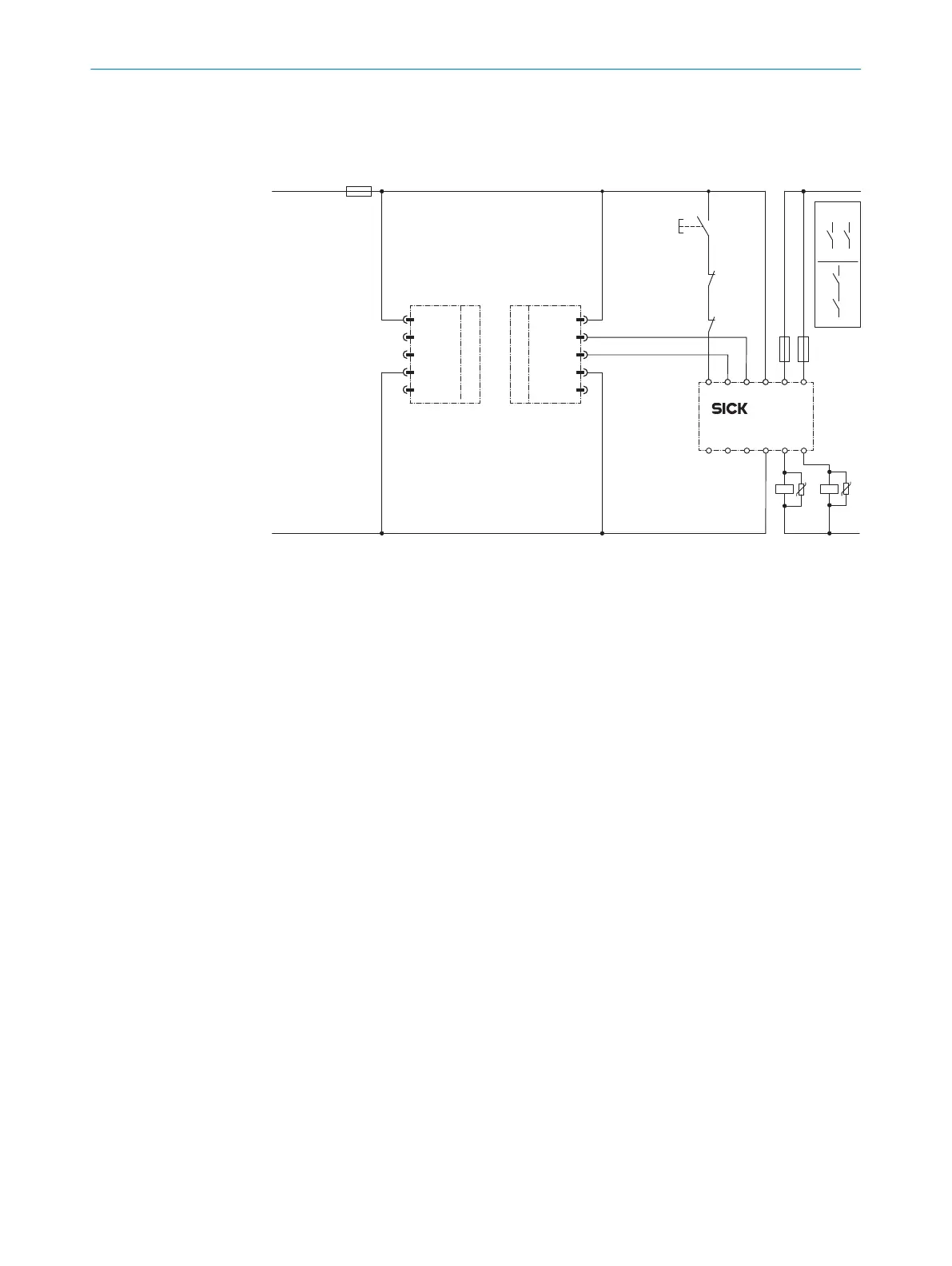 Figure 14: Connection diagram for RLY3-OSSD2 with restart interlock and external device moni‐