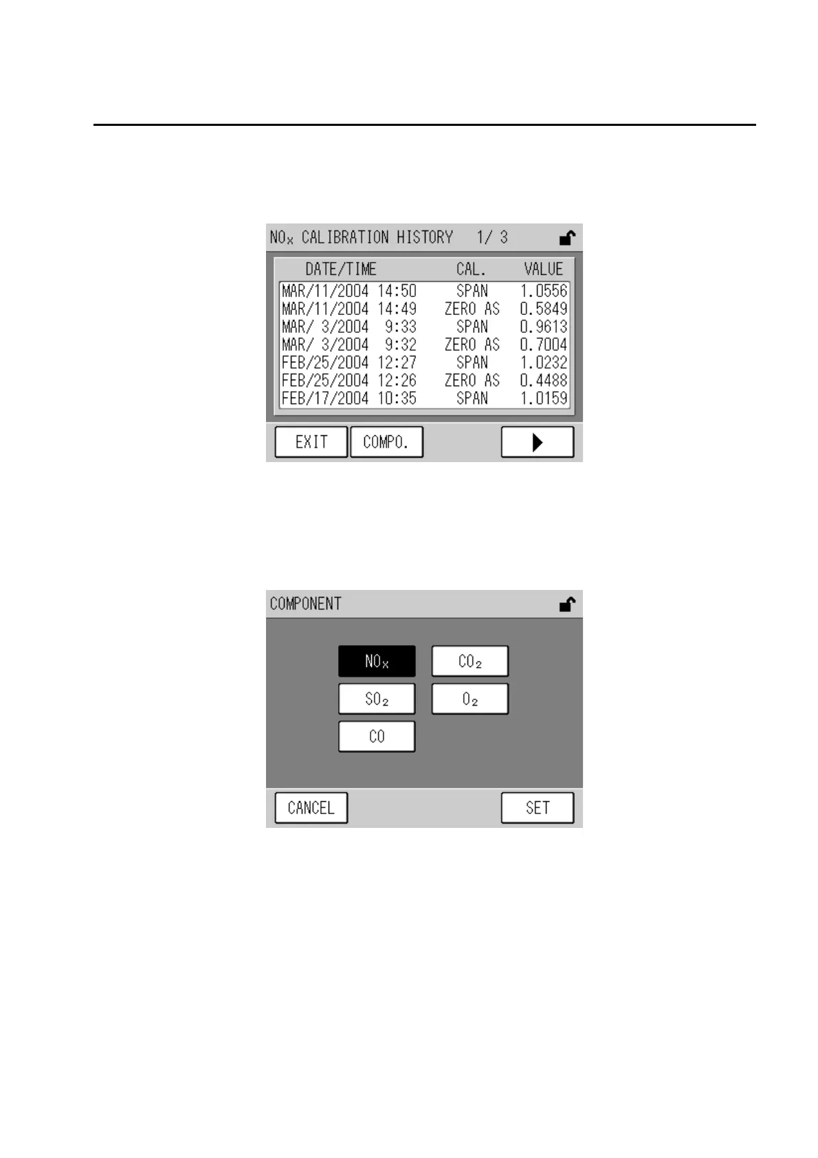 The displayed component is changed, and the screen returns to the CALIBRATION HISTORY