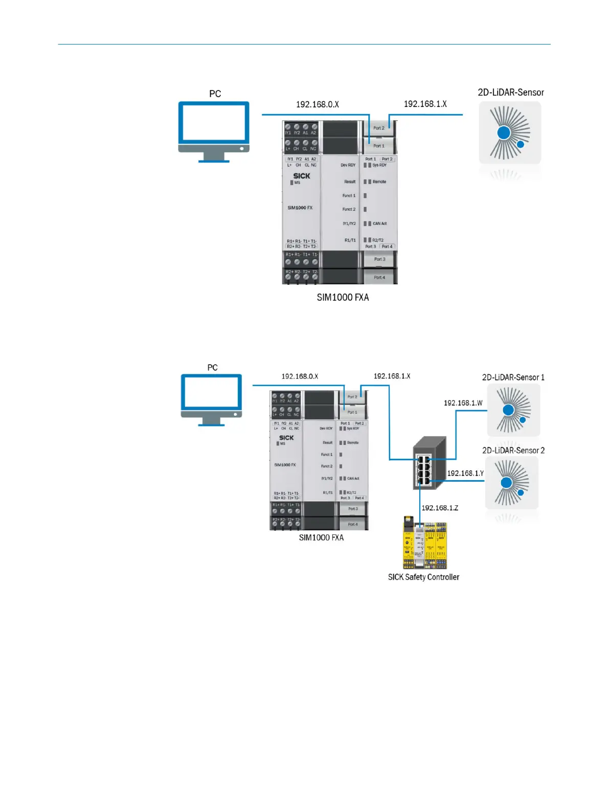 Figure 8: Example of a connection with SIM1000 FXA, a service computer (PC), a switch, a SICK