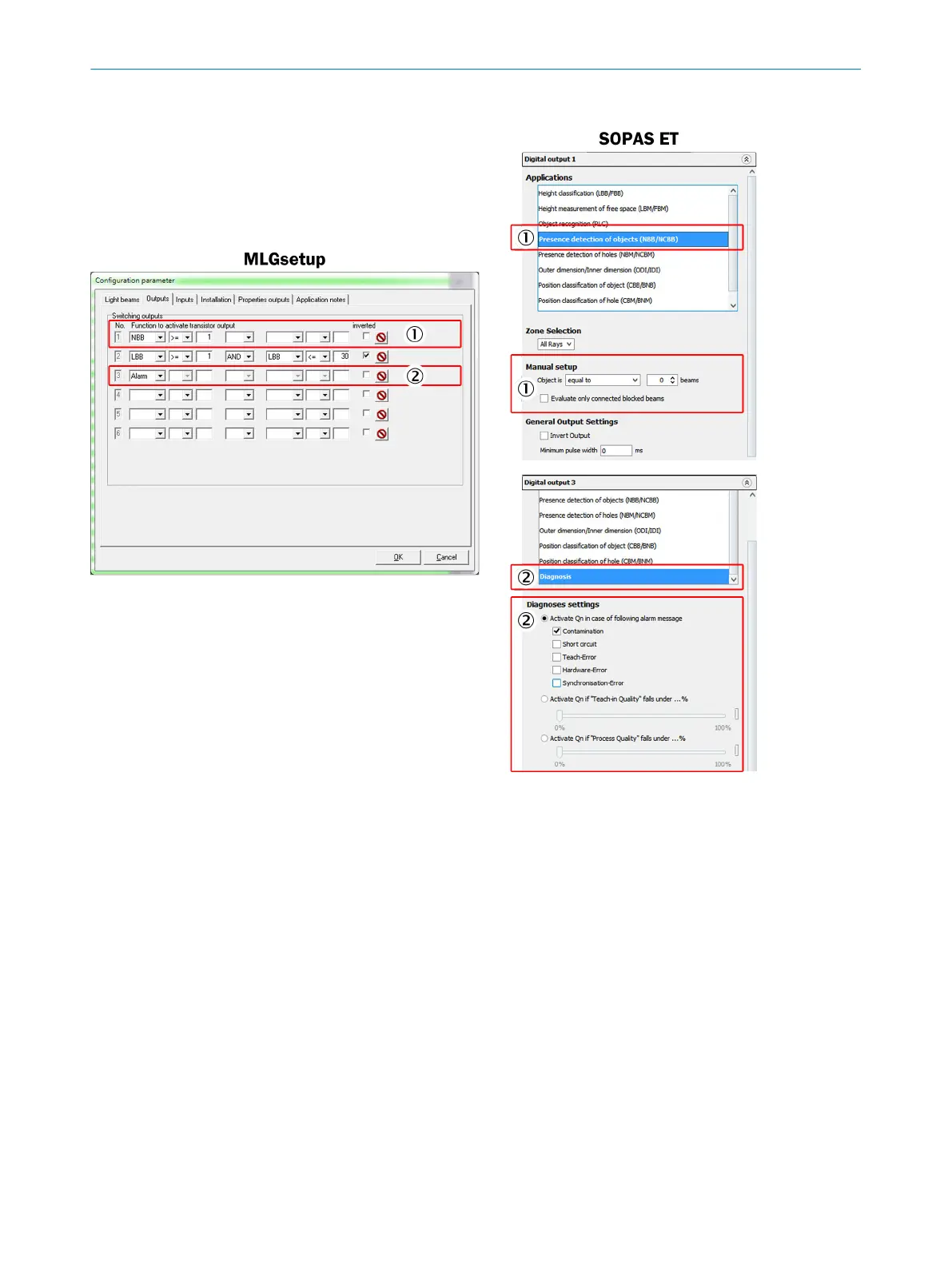 Figure 19: Outputs in MLGsetup and SOPAS ET