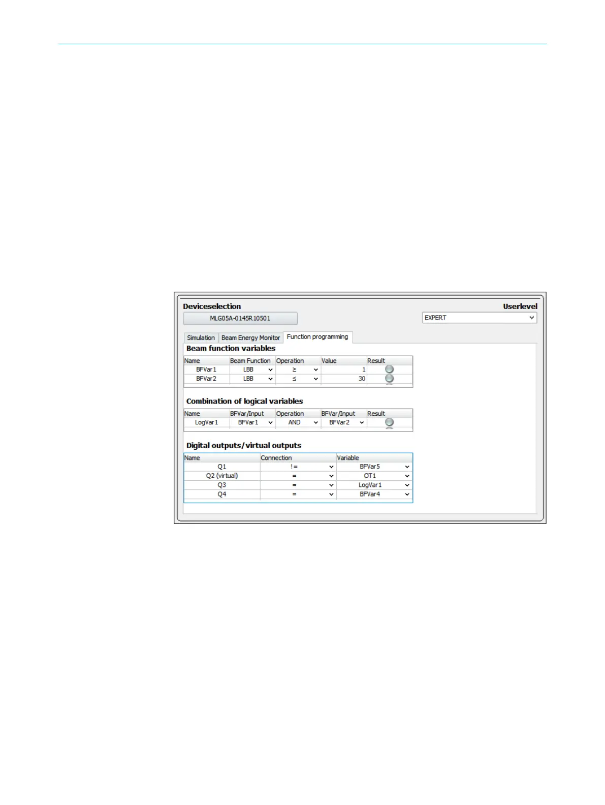 “LBB >= 1 AND LBB <= 30”. To configure this function in SOPAS ET, proceed as follows: