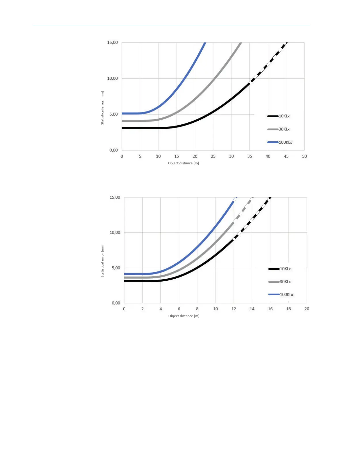 Figure 31: Statistical error for white objects as a function of object distance for various ambient