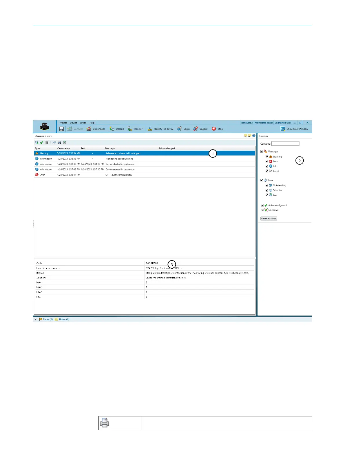 Events such as errors, warnings and information are stored in the message history.