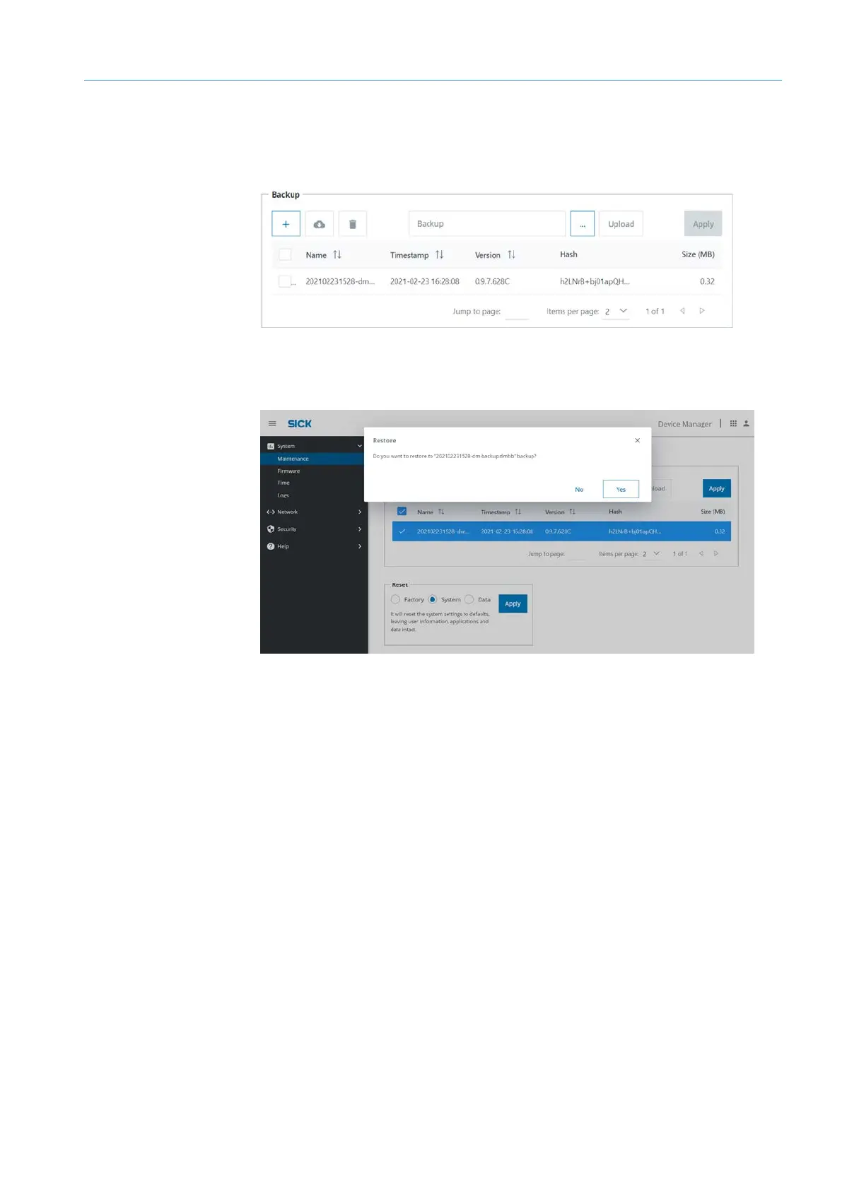 Confirm safety note. The selected backup will be installed.