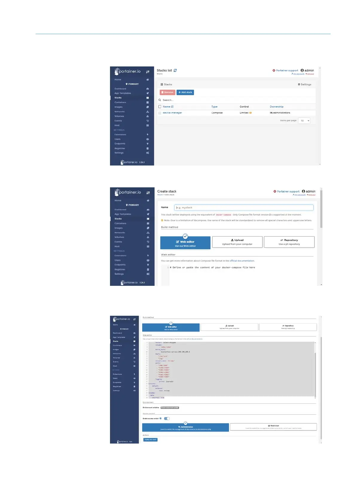 Click Stacks in the navigation pane. The list of Docker stacks already in use in TDC-E