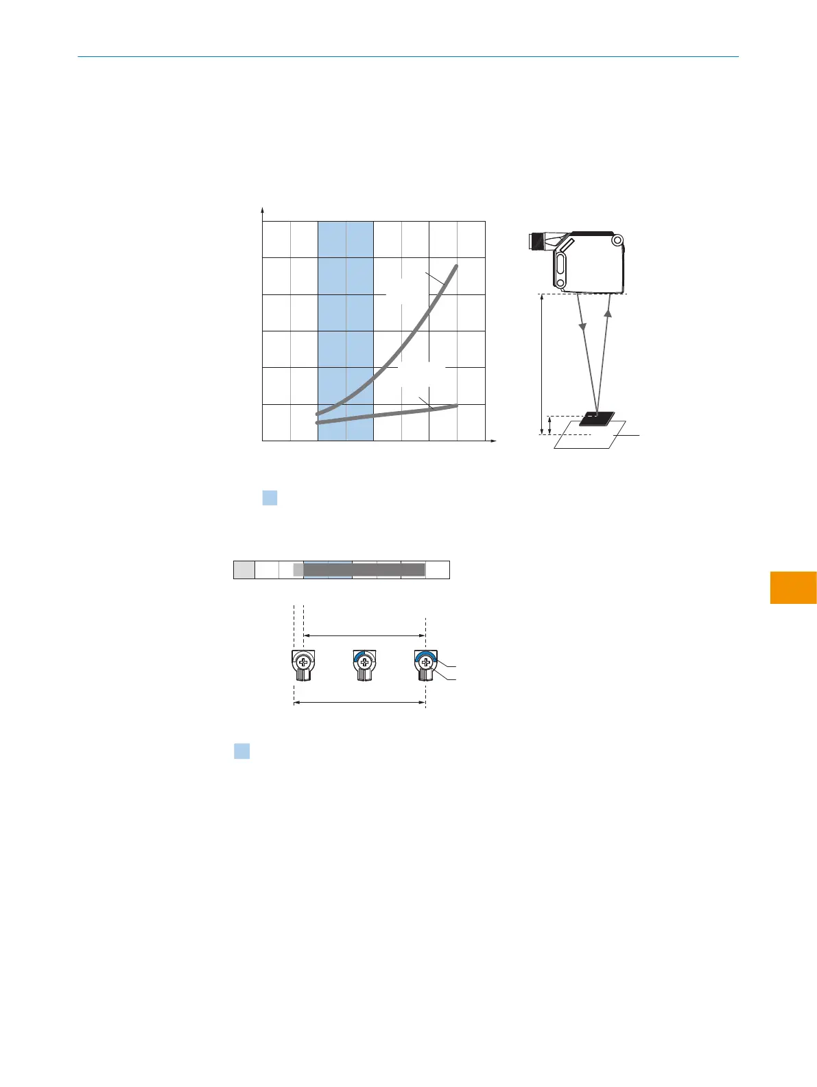 離、y = 最小対象物高さ。拡散反射率: 6% = 黒 1、90% = 白 2 (DIN 5033 に準拠し
