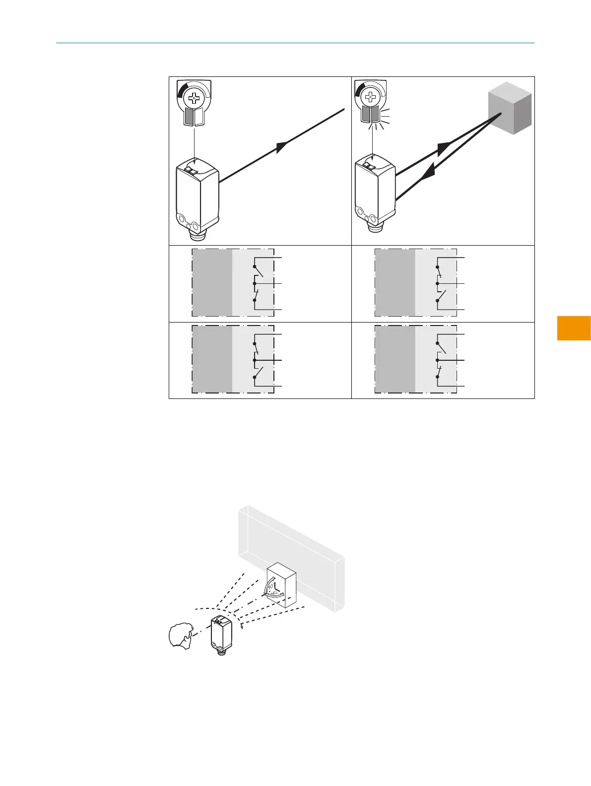Align the sensor with the object. Select the position so that the red emitted light beam