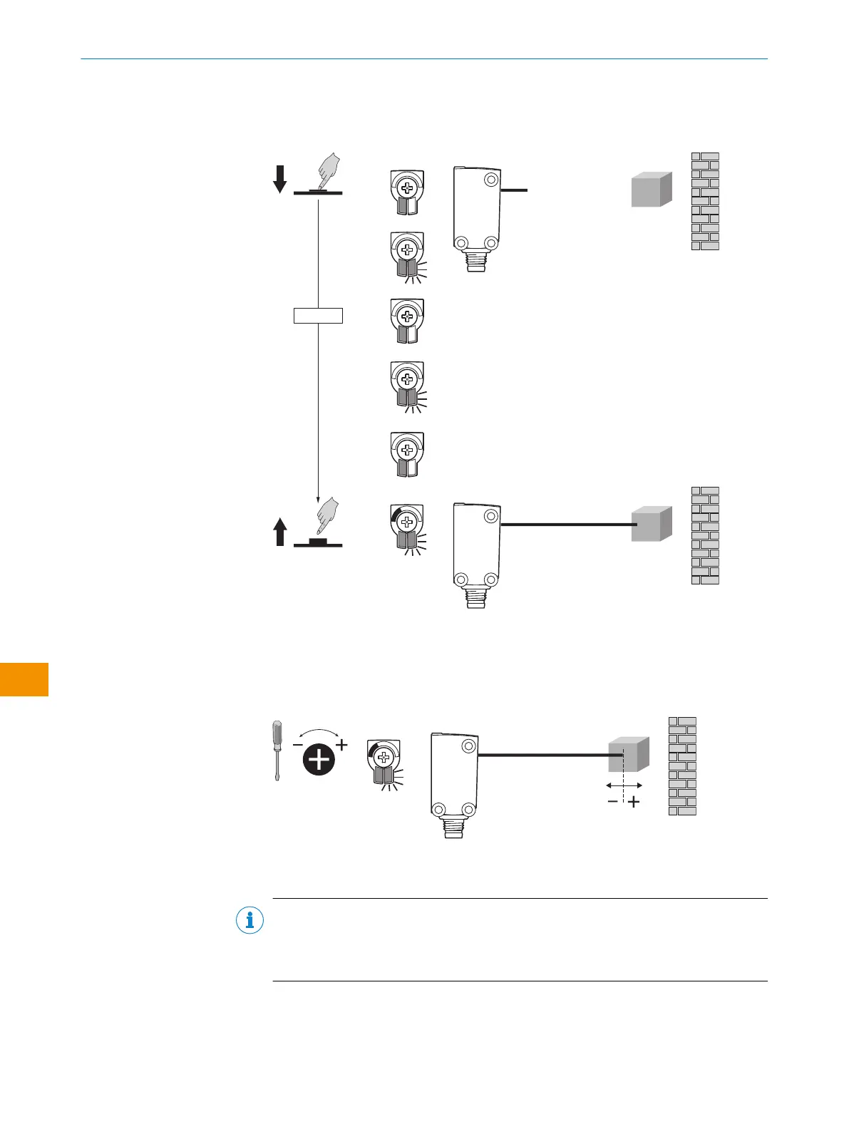1. O ajuste da distância de comutação é efetuado com a pressão da tecla teach-in