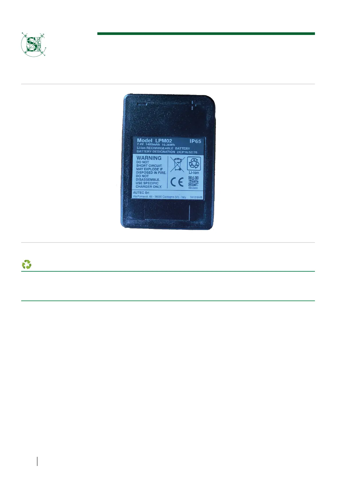 Specifications: Autec model LPM02, 7.4 V, 1400 mAh, 10.36 Wh, Li-ion