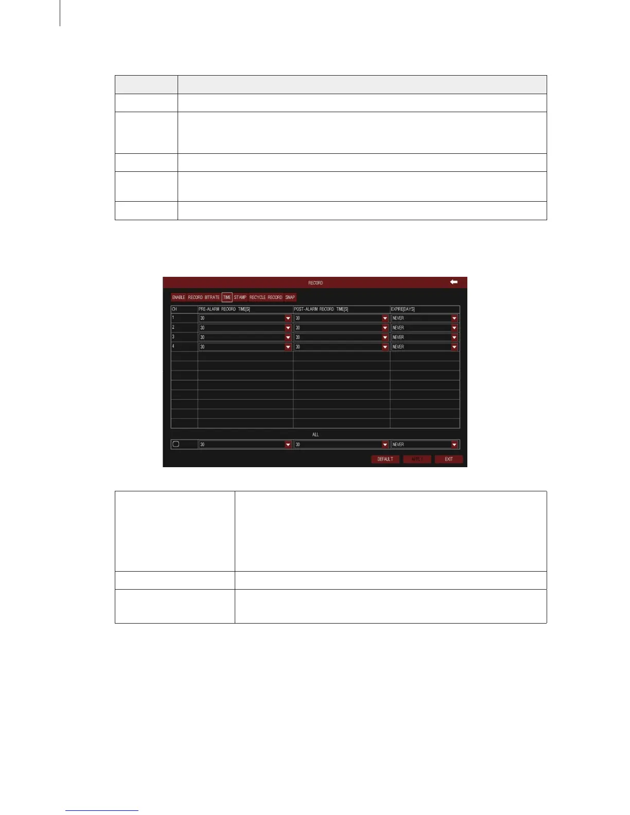 Expire The hold time of recorded les. If the video les are overdue, they will