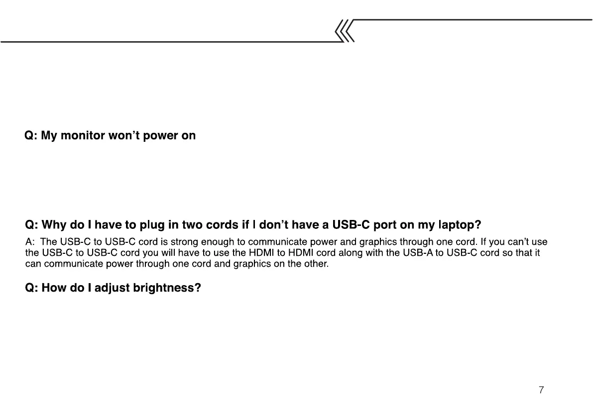 A: • If you are not using a USB-C to USB-C cord, then make sure your monitor is connected properly to your laptop with