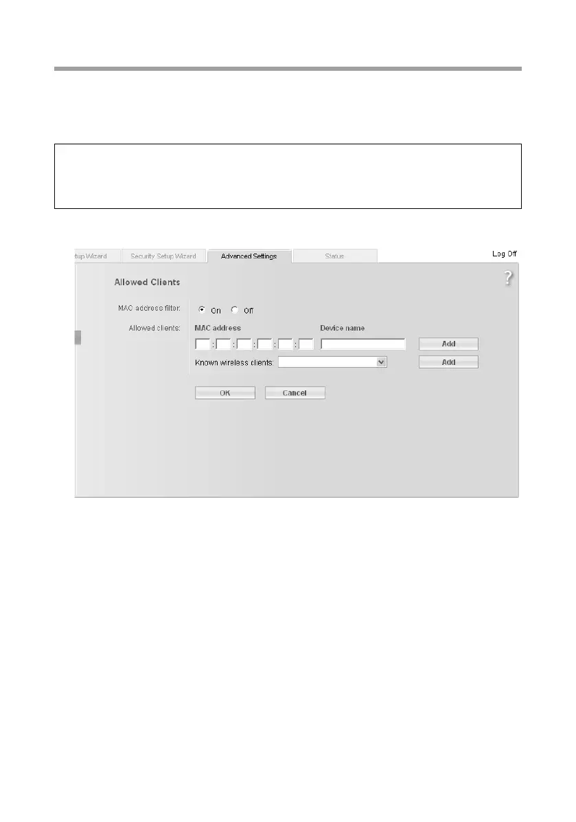 In this screen you can specify which PCs will have wireless access to the Gigaset WLAN