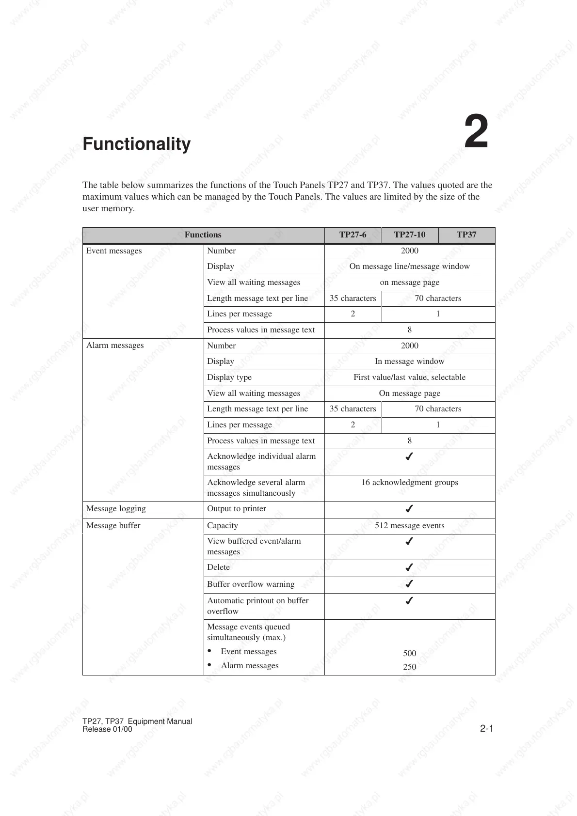 The table below summarizes the functions of the Touch Panels TP27 and TP37. The values quoted are the