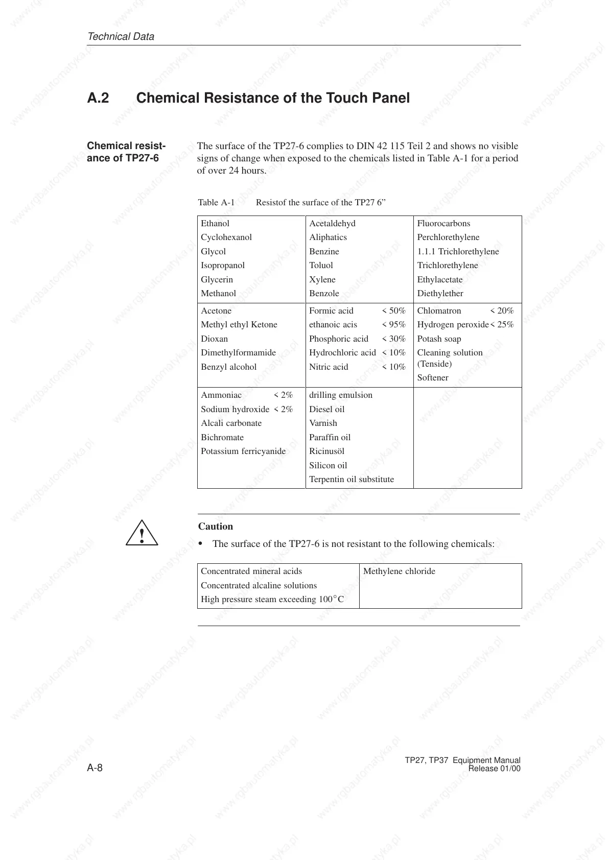 S The surface of the TP27-6 is not resistant to the following chemicals: