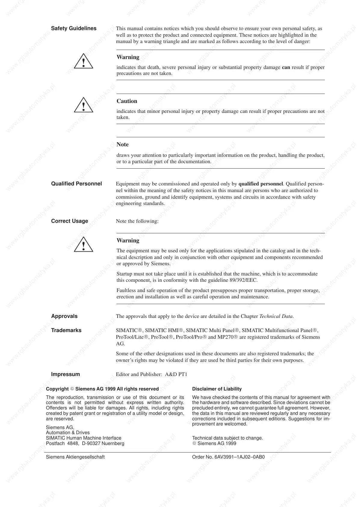Siemens Aktiengesellschaft Order No. 6AV3991–1AJ02–0AB0