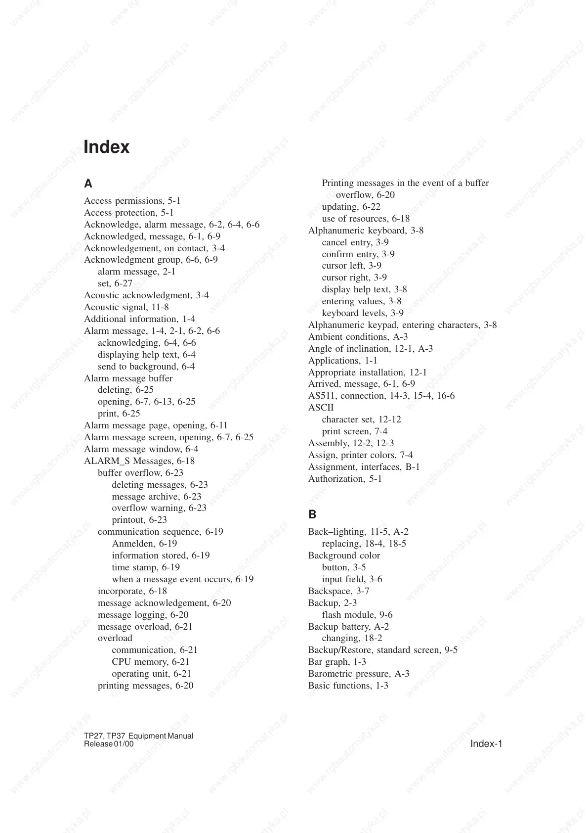 Acknowledge, alarm message, 6-2, 6-4, 6-6