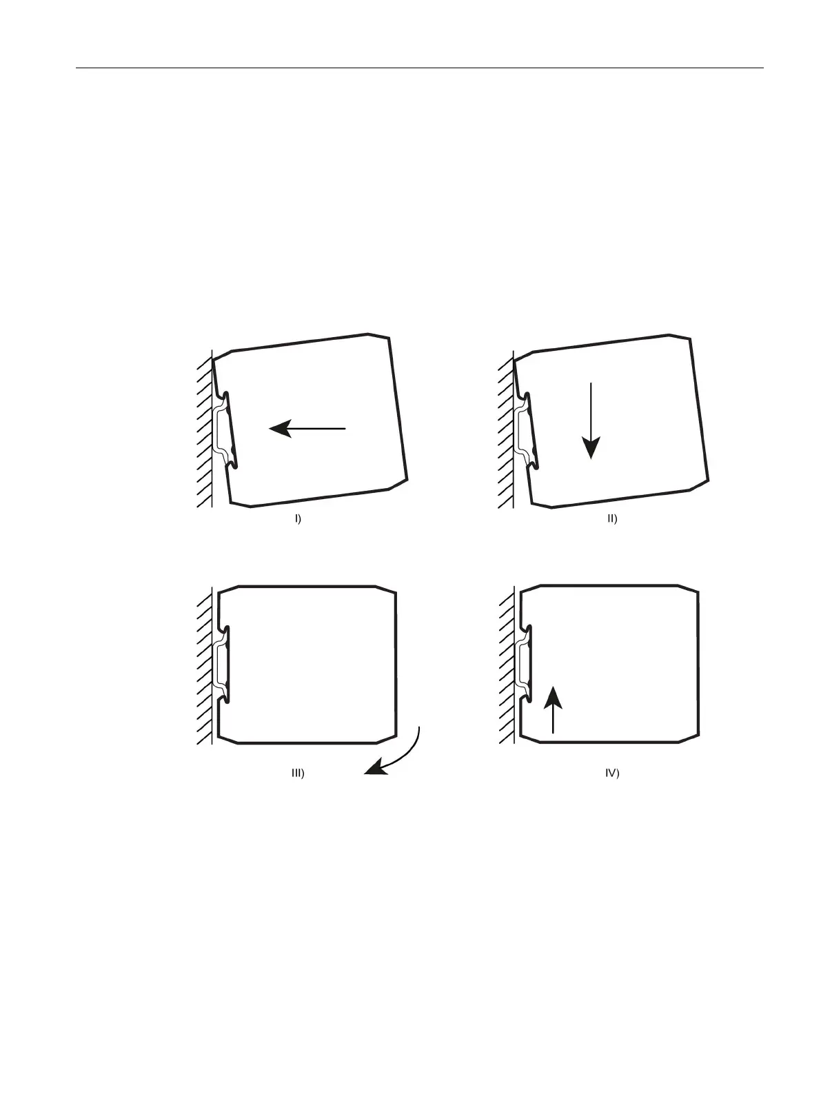 To snap on, attach the device to the top of the mounting rail (I), press down gently (II), press-