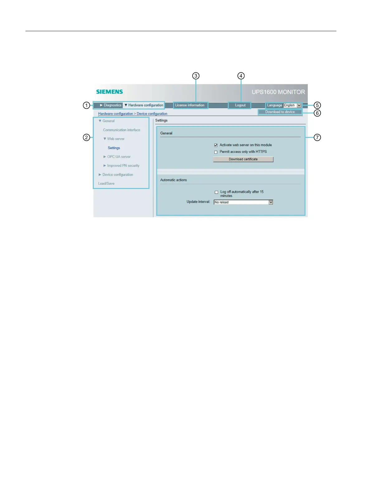 ⑤ is used to select the user interface language of the web server.