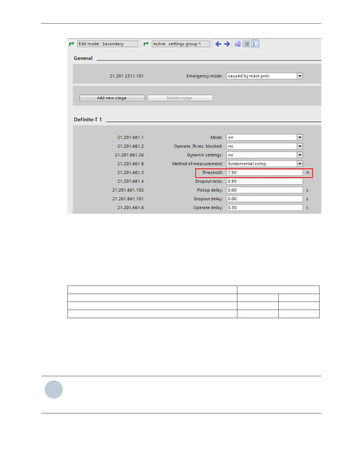Threshold value secondary (active setting view) 7.5 A 1.5 A