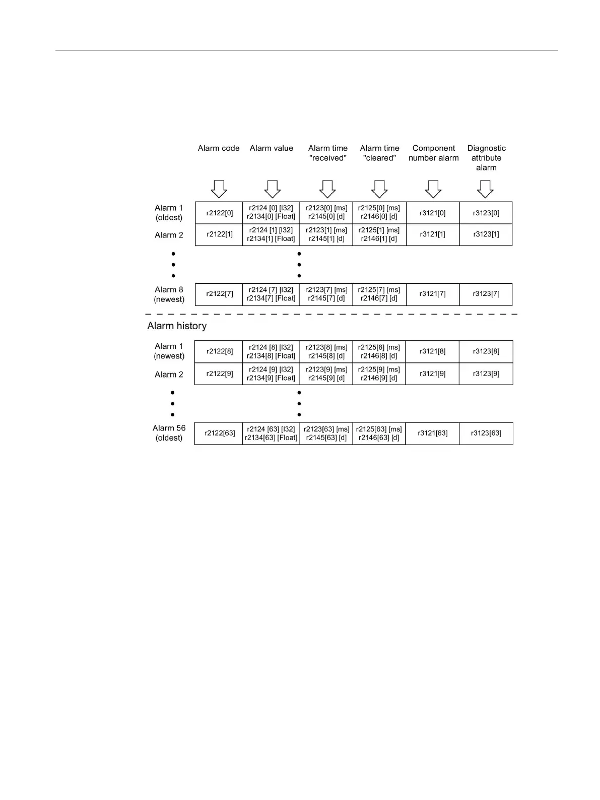 resolved). The alarm history occupies the last indices ([8...63]) of the parameter.