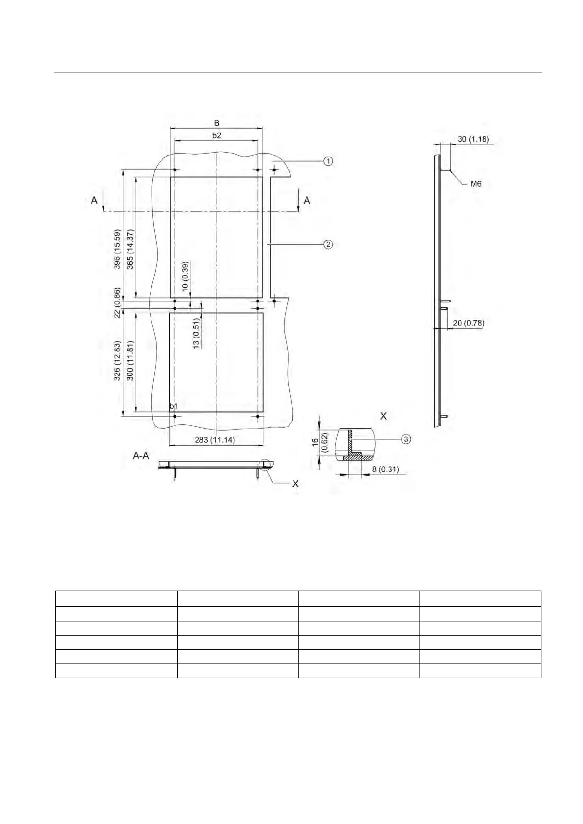 Figure 4-21 Openings to mount an Active Line Module 300 mm with external air cooling, all data in mm and (inches)