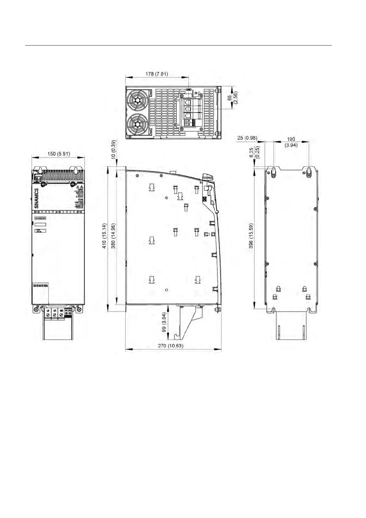 Figure 4-52 Dimension drawing of 40 kW Basic Line Module with internal air cooling, all dimensions in mm and (inches)