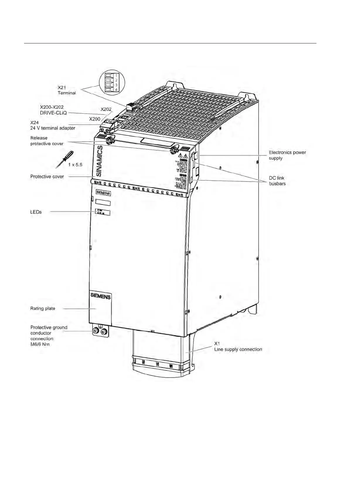 Figure 4-77 Interface overview, 36 kW and 55 kW Smart Line Modules with internal air cooling (example: 55 kW)