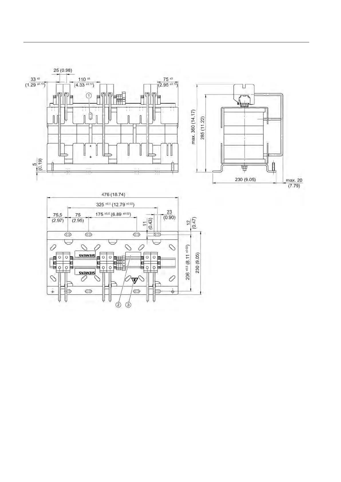 Figure 3-34 Dimension drawing of HFD line reactor 120 kW, all dimensions in mm and (inches)