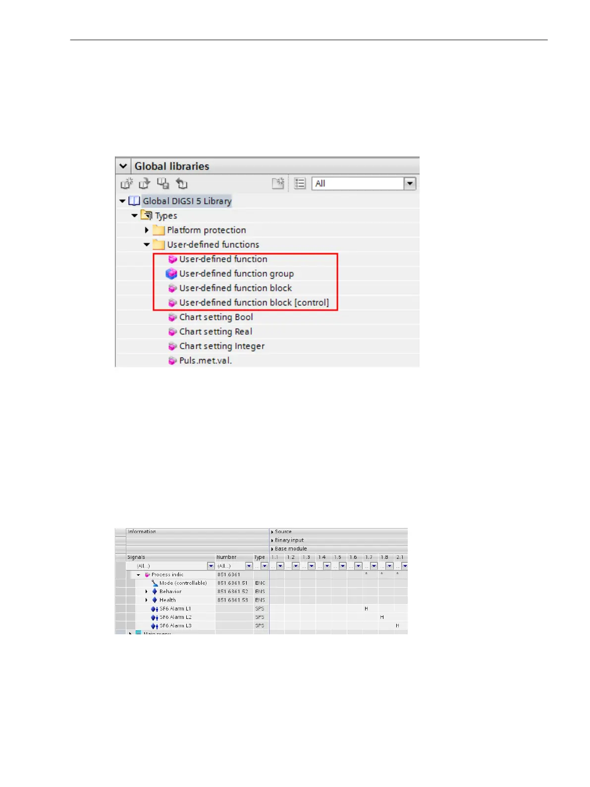 The user-defined function block allows you to add (see following figure) single-point indications, pickup indi-